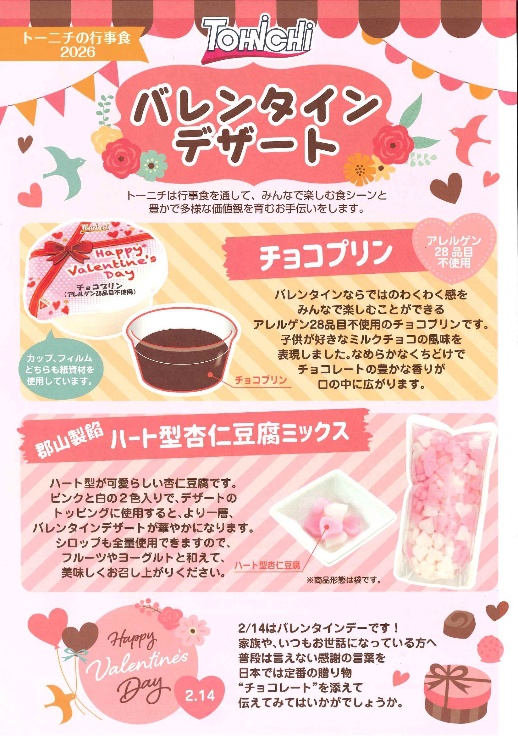 そんな心あたたまる季節に合わせて、やさしい甘さの「チョコプリン(アレルゲン28品目不使用)」と、かわいらしい「郡山製餡:ハート型杏仁豆腐ミックス」をご用意しました。